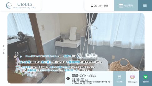 UtoUto Relaxation × Beauty Salonは、プライバシーに配慮した完全個室のプライベート空間を完備し、身体に関するさまざまなお悩みに寄り添う環境を整えております。静かで落ち着いた個室の中で、自分だけの優雅なエステの時間を過ごしていただけるよう、日々の忙しさを忘れて非日常を感じられる空間設計に配慮しています。心身ともに安らぐリラクゼーションの環境とおもてなしの心を大切にし、憩いのひとときの創出に努め、日常の多忙な生活環境から離れ、自分自身をねぎらう憩いのひとときをリラクゼーションの施術でサポートいたします。