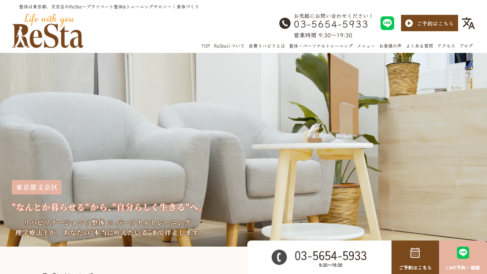 ReStaの特徴として、1枠につき1名限定の完全プライベート空間を提供し、ほかのお客様の目を気にすることなく、じっくりと身体や悩みと向き合っていただける環境を整えています。ご家族の付き添いやお子さまと一緒のご来店も歓迎しており、「話しづらい」「相談しづらい」と感じていたことも安心してお話しいただける雰囲気づくりを大切にしています。パーソナルトレーニングでは、ミドル・シニア世代の方や、痛み・関節の変形がある方でも安心して行えるよう、関節への負担や既往歴を考慮しながら、体力・年齢・目的に合わせてオーダーメイドのトレーニングメニューを作成し、「運動が苦手」「ジムはハードルが高い」と感じている方にも無理なく続けられるプログラムを提案しています。 肩こり整体、頭痛ケア整体、ストレッチ整体、リハビリ整体、パーソナルトレーニングなど、お悩み別のプログラムを用意し、それぞれの症状や目的に合わせた細やかな対応を可能にしています。肩こり整体では、背中や胸まわり、肩甲骨の動き、猫背や巻き肩などの姿勢も含めて整え、頭痛ケア整体では、緊張型の頭痛に対して首や肩、背中の筋肉の緊張や姿勢の乱れを和らげ、ストレッチ整体では、全身の硬さを無理のない範囲でゆっくり伸ばし、リハビリ整体では、退院後やケガ後の動きのぎこちなさに対して軽いリハビリ要素を含んだ整体と運動指導を行っています。