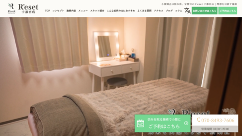 R’eset 宇都宮店では、一人ひとりのお悩みに寄り添った施術をご提供しています。カウンセリングを重視し、生活習慣やお身体の状態を丁寧にヒアリングすることで、それぞれの身体の悩みに合った施術で根本ケアを行っています。肌・腰・肩・腸など、身体の不調やお悩みは人それぞれ異なるため、画一的な施術ではなく、肌トラブルの改善はもちろん、腰や肩のつらさ、腸内環境の乱れなど、根本からのケアを目指しています。無理のない施術を心がけながら、安心して通える空間で、心と身体のバランスを整え、健やかな毎日をサポートしています。 体質改善や施術後の結果にこだわり、丁寧で正確な「効果の出る」施術を大切にしています。小顔矯正を専門とし、一人ひとりの悩みに丁寧に向き合い、結果を大切にした確かな施術で変化を実感していただけます。心と身体のバランスを整えながら、本来の美しさを引き出すことを目指し、完全予約制の女性専用プライベートサロンとして、人目を気にせず、安心してゆったりと自分だけの時間をお過ごしいただける環境を整えています。