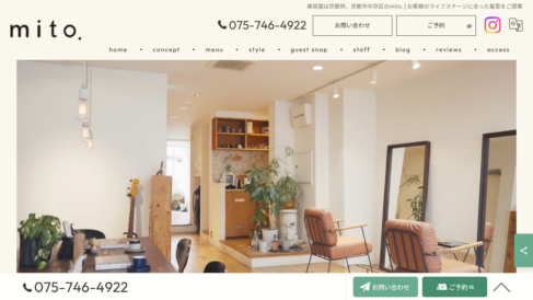 mito.では、お客様の髪と人生に長く寄り添いながら施術をご提供することを重視し、京都市で尽力しております。年齢による変化に負けない、今だからこそ似合うスタイルを、一緒に見つけていけるような対応を行う美容室です。10周年を迎え、スタッフもお客様も気づけば家族のような存在になりました。「久しぶり」「最近どう?」と自然に話がはじまる、あたたかさのあるサロンです。長く通っていただく中で、ライフステージの変化や環境の変化も一緒に経験してきました。 だからこそ、髪の悩みだけでなく、「こうなりたい」という想いにも寄り添える存在でいたいと考えています。いつ訪れてもほんのり安心できる場所を目指しています。毎日の中でふと鏡を見たときに、今日の自分が少し好きになれる。そんな小さなときめきが暮らしを明るくしてくれると私たちは考えています。特別な日でなくても、毎日が少し優しく見えるようなヘアスタイルをお届けしています。営業時間は10:00~19:00(最終受付18:00)、金曜日のみ20:00(最終受付19:00)で、毎週月曜日・火曜日が定休日です。