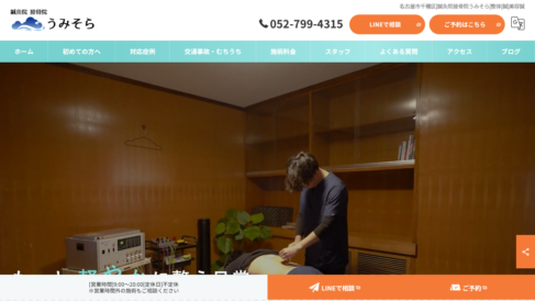 名古屋市千種区の鍼灸院接骨院うみそらでは交通事故の専門施術を受けることができ、自賠責保険が適用される場合は窓口負担はありません。事故直後には特に何も感じなくても、後から身体に不調が出ることがあります。ご自身では判断が難しい場合も多いですが、提携整形外科もご案内可能ですので、お気軽にご相談ください。むち打ちからくるしびれや頭痛、肩こり・腰痛などの身体の痛み後遺症を残さないようサポートし、スポーツ後や交通事故後の不調もお任せいただけます。完全個室の落ち着いた空間で心からリラックスし、身心の悩みから解放される体験をご提供いたします。